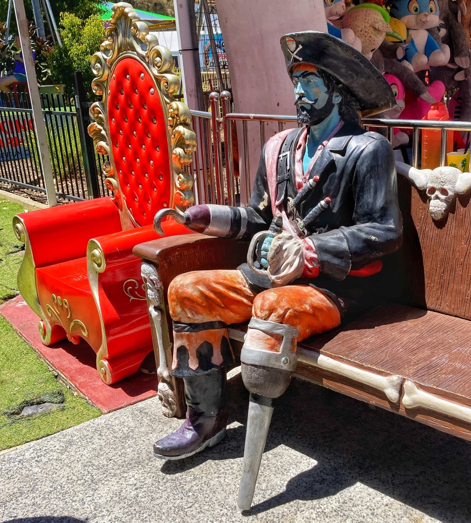 A pensive pirate sat on a bench near the entrance gazing into the distance, perhaps at the pirate ship passing by on the river.