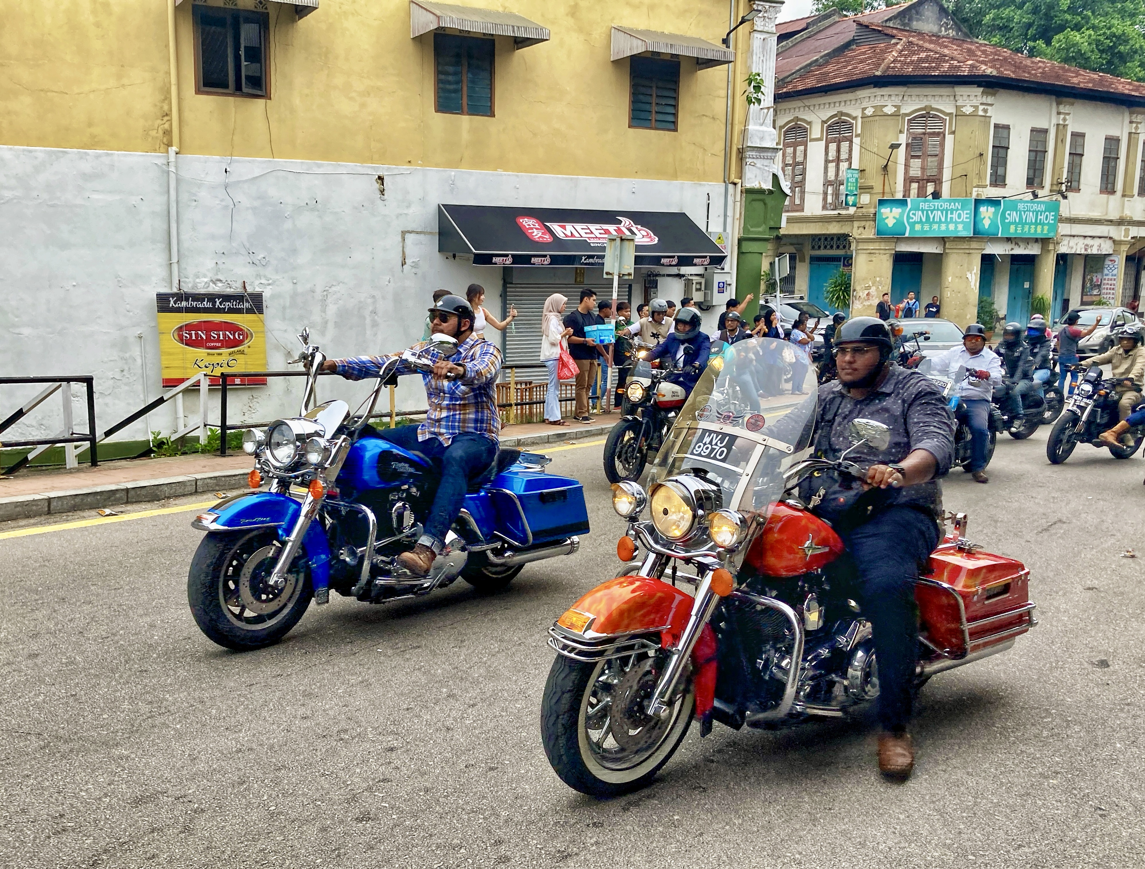 Strolling around Melaka in Malaysia on an overcast Sunday, we were seduced by the growl of powerful engines from a throng of more than 120 motorbikes outside a popular riverside cafe.